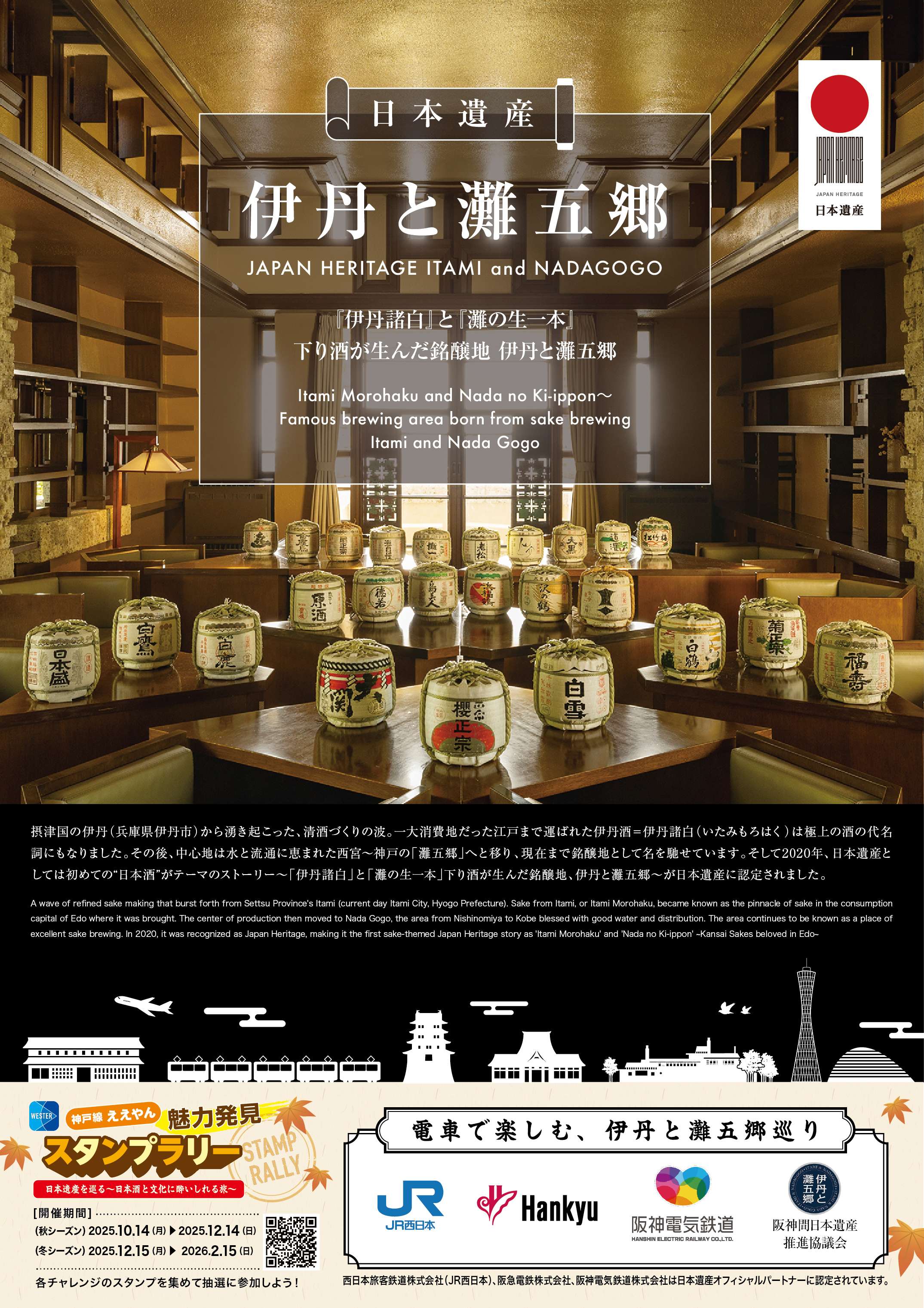 {"ops":[{"insert":"西日本旅客鉄道株式会社は、移動生活ナビアプリ「WESTER」を活用したデジタルスタンプラリー「神戸線ええやん魅力発見スタンプラリー」を開催しています。\n阪神間日本遺産推進協議会との連携チャレンジである「日本遺産を巡る ~日本酒と文化に酔いしれる旅~」も実施しています。是非ご参加ください。\n\n1.実施期間\n2025年4月14日(月)~2026年2月15日(日)\n秋シーズン :2025年10月14日(火)~2025年12月14日(日)\n冬シーズン :2025年12月15日(月)~2026年 2月15日(日)\n ※春夏シーズンは、10月13日(月)をもって終了\n※シーズン毎に抽選で賞品をプレゼントします。\n\n2.スタンプラリーの概要(秋シーズン・冬シーズン)\n 春夏シーズンから続く阪神間、神戸、姫路の主な観光スポットなどを巡る3つの「エリアチャレンジ」と地域一推しの個別テーマに沿ってスポットを巡る合わせた「テーマチャレンジ」などに、新たな「テーマチャレンジ」を設定します。エリアやテーマに沿った合わせた各スポットを訪れ、チェックインしてスタンプを獲得します。\n 各チャレンジのスタンプ獲得数に応じて、抽選で各地域の魅力が詰まった素敵な賞品やWESTERポイントをプレゼントします。\n※スポットやチャレンジの詳細は、特設サイトでご確認ください。\n\n3.協力\n 神戸市、尼崎市、西宮市、芦屋市、阪神間日本遺産推進協議会、(一財)神戸観光局、\n(一社)あまがさき観光局(公社)姫路観光コンベンションビューロー、\n(株)神戸ウォーターフロント開発機構\n\n4.その他\n・スタンプラリーの詳細は特設サイトをご覧ください。\t\nURL:https://www.nta.co.jp/maas/kobesensr\n\n"}]}