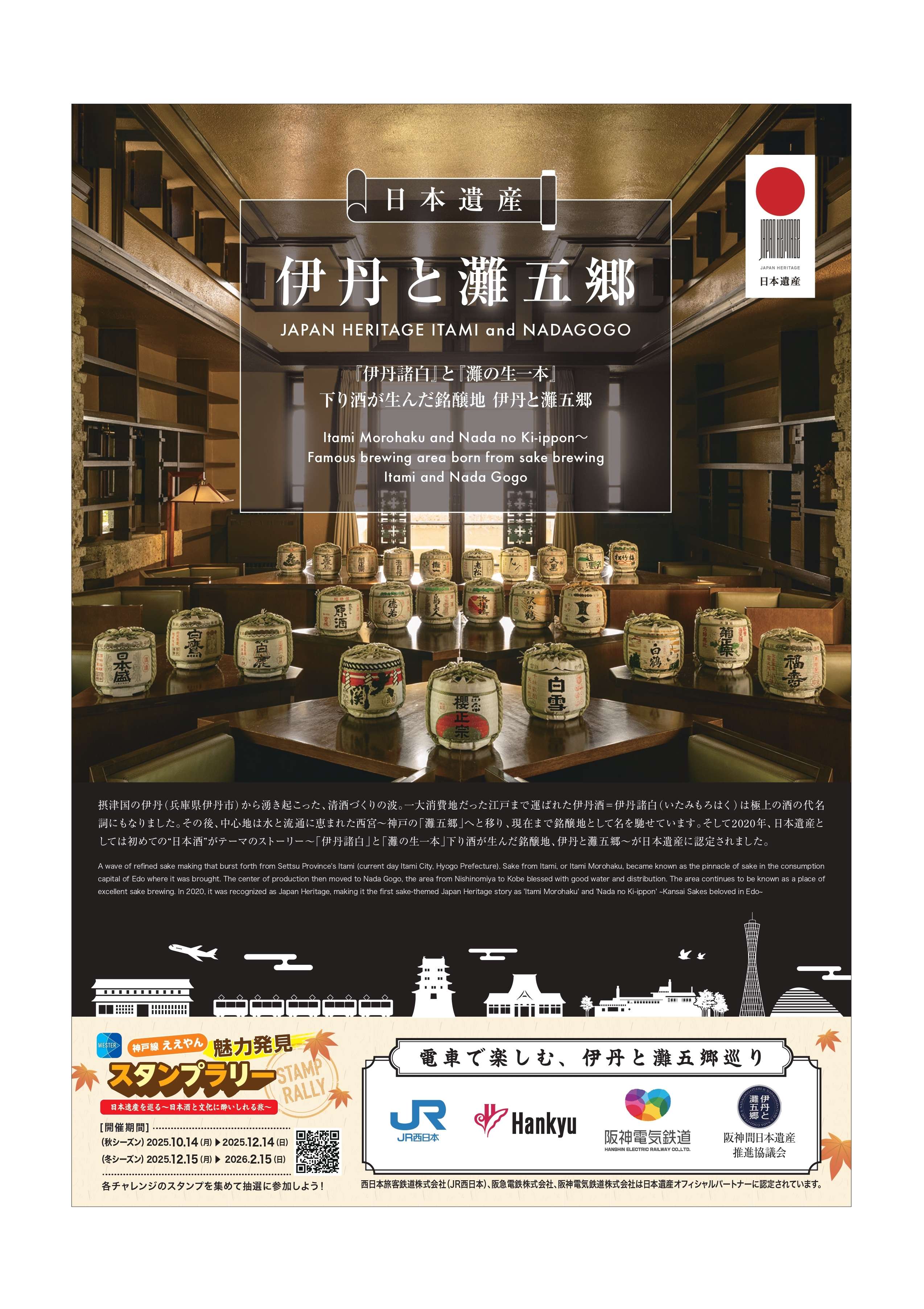 {"ops":[{"insert":"西日本旅客鉄道株式会社は、移動生活ナビアプリ「WESTER」を活用したデジタルスタンプラリー「神戸線ええやん魅力発見スタンプラリー」を開催しています。\n阪神間日本遺産推進協議会との連携チャレンジである「日本遺産を巡る ~日本酒と文化に酔いしれる旅~」も実施しています。是非ご参加ください。\n\n1.実施期間\n2025年4月14日(月)~2026年2月15日(日)\n秋シーズン :2025年10月14日(火)~2025年12月14日(日)\n冬シーズン :2025年12月15日(月)~2026年 2月15日(日)\n ※春夏シーズンは、10月13日(月)をもって終了\n※シーズン毎に抽選で賞品をプレゼントします。\n\n2.スタンプラリーの概要(秋シーズン・冬シーズン)\n 春夏シーズンから続く阪神間、神戸、姫路の主な観光スポットなどを巡る3つの「エリアチャレンジ」と地域一推しの個別テーマに沿ってスポットを巡る合わせた「テーマチャレンジ」などに、新たな「テーマチャレンジ」を設定します。エリアやテーマに沿った合わせた各スポットを訪れ、チェックインしてスタンプを獲得します。\n 各チャレンジのスタンプ獲得数に応じて、抽選で各地域の魅力が詰まった素敵な賞品やWESTERポイントをプレゼントします。\n※スポットやチャレンジの詳細は、特設サイトでご確認ください。\n\n3.協力\n 神戸市、尼崎市、西宮市、芦屋市、阪神間日本遺産推進協議会、(一財)神戸観光局、\n(一社)あまがさき観光局(公社)姫路観光コンベンションビューロー、\n(株)神戸ウォーターフロント開発機構\n\n4.その他\n・スタンプラリーの詳細は特設サイトをご覧ください。\t\nURL:https://www.nta.co.jp/maas/kobesensr\n\n"}]}